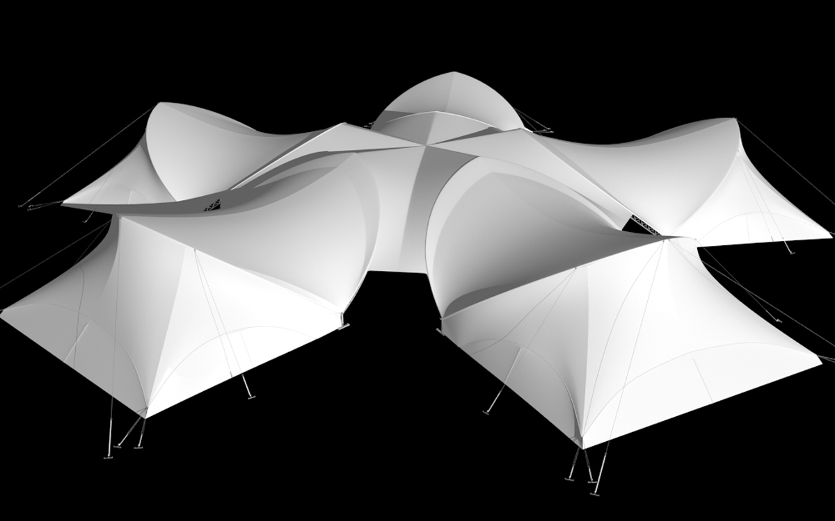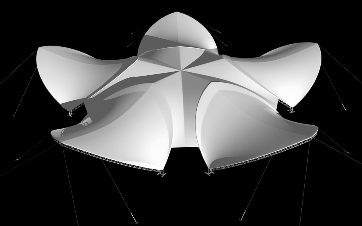 П’ять тентів-пелюсток UnoSpace, об’єднаних одним загальним дахом-куполом, утворюють оригінальну конструкцію PentaSpace.