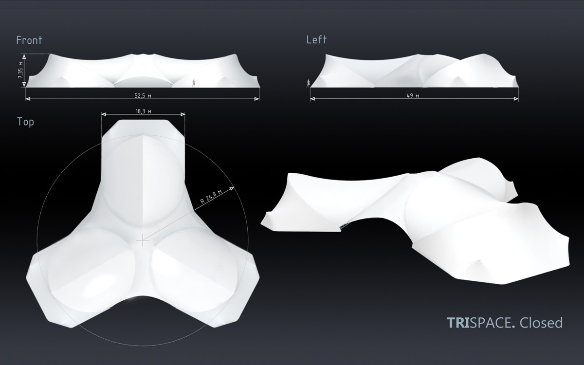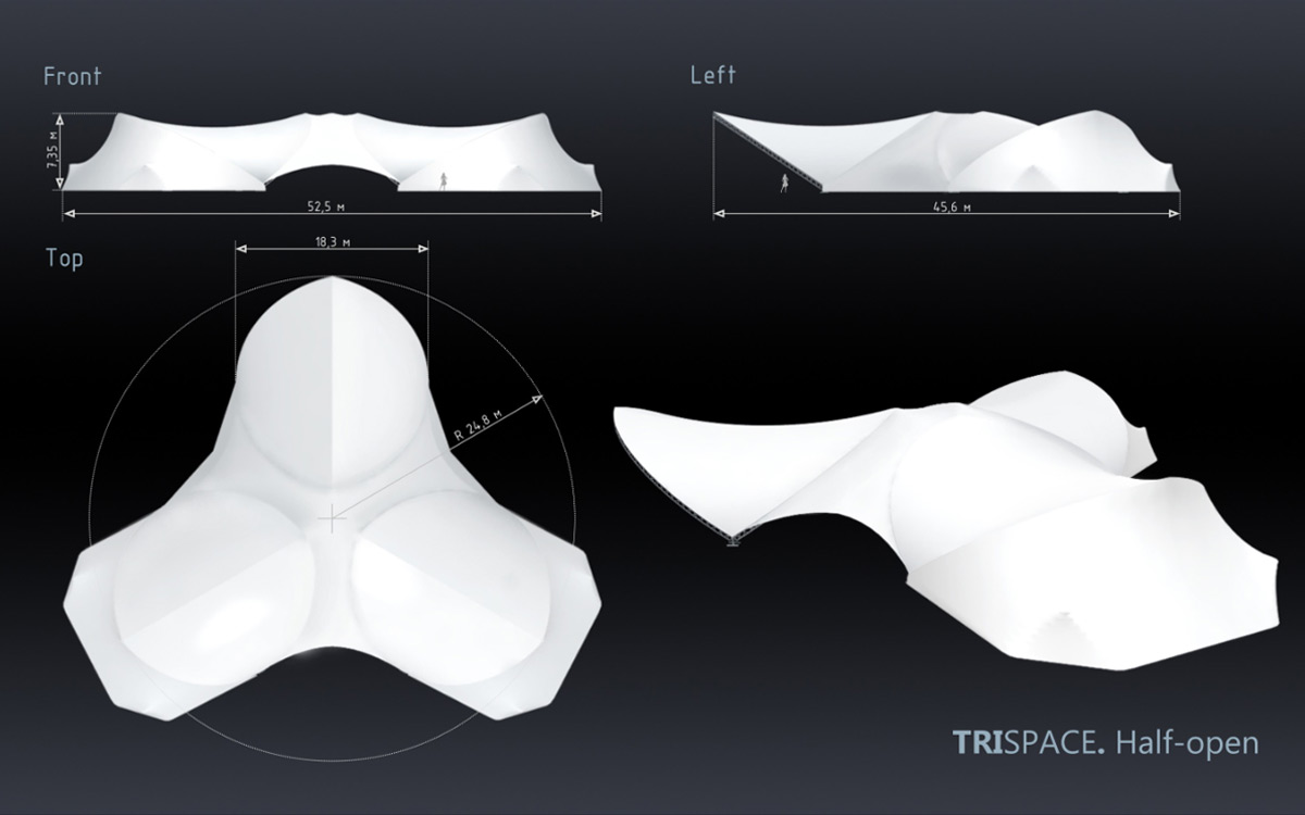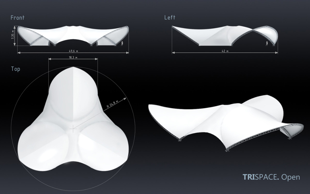 Тентова конструкція TriSpace open побудована з трьох тентів-пелюсток UnoSpace open, об’єднаних одним загальним дахом-куполом.